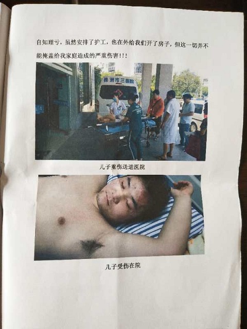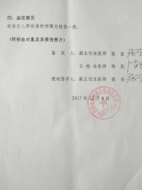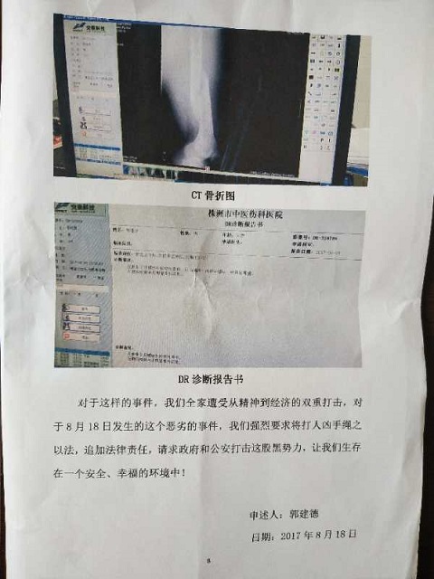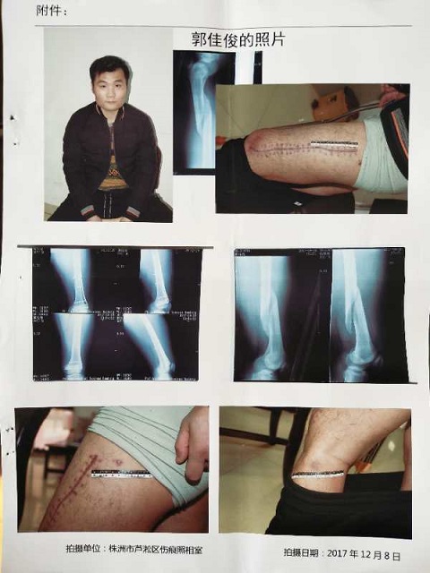 郭建德气愤填膺地说,儿子被打残之后,还只住了几天院,办事处就催赶紧出院!医生告诉我,“你儿子必须每月要来复查一次,否则后果难料”!在我们强烈要求之下,住院治疗延续了两个多月。至目前为止,我儿子的身体恢复状况不予乐观,因气候变化时疼痛难忍,大汗淋漓!