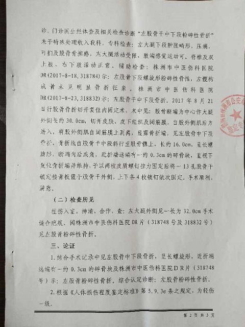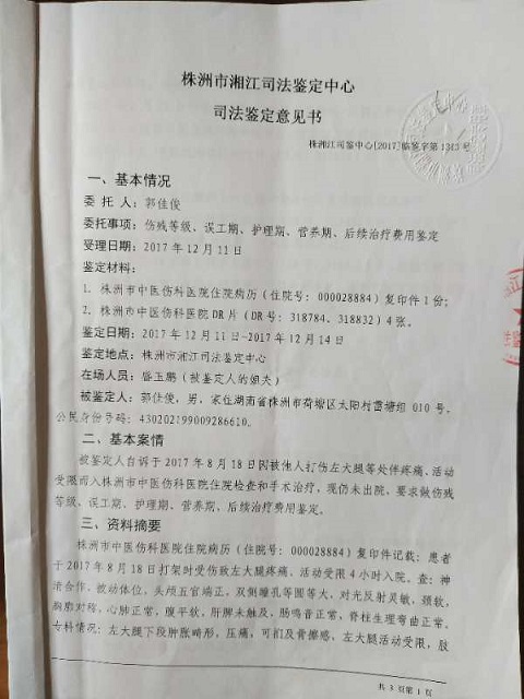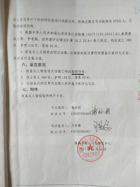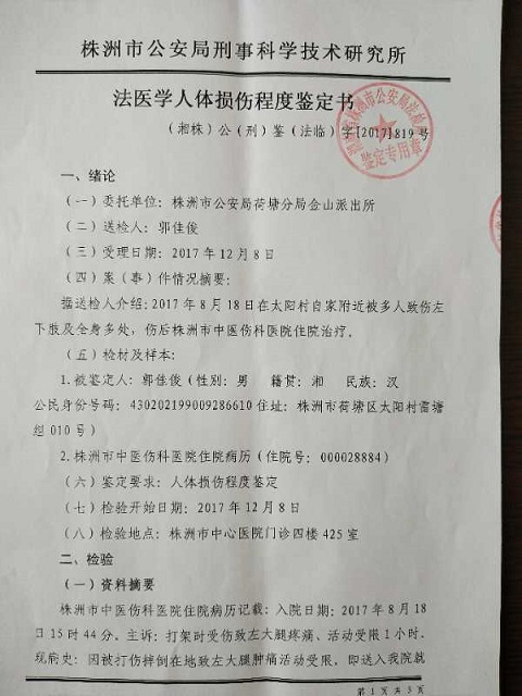 漆美炎怒发冲冠的说:“我儿媳妇在强拆房屋前一天晚上23点分娩婴儿,儿子(郭佳俊)在医院照料。次日早上8点--8:30分,儿子联系我和我爱人不上,回家拿婴儿的衣服及他自己的换洗衣服。离快到家30--40米左右,刚下‘的士’,其中就有人说,郭建德的崽回家了!蓦然间,二三十人一拥而上,将我儿子团团围住,惨无人道的用灭火器直喷我儿子双眼,接下来就是一顿暴打,致左脚大腿骨全部断裂。经司法鉴定为轻伤(附:鉴定书)!”说到此,漆美炎潸然泪下,泪洒衣裳。
