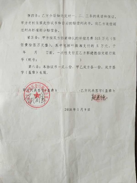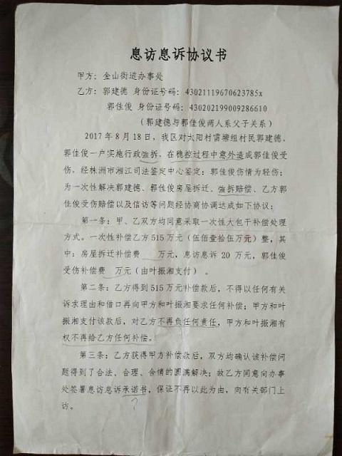 “房屋被强拆后,生活无着落。办事处的工作人员石治国曾多次对我进行威胁恐吓:‘如果你不签《息访息诉协议书》,那你房屋补偿费就不会给你,否则你将要承担强拆费用,还要倒出资给政府’!迫于公权力的无奈,只好违心签下了这份所谓的霸王《息访息诉协议书》”。郭建德颓丧消沉的说。