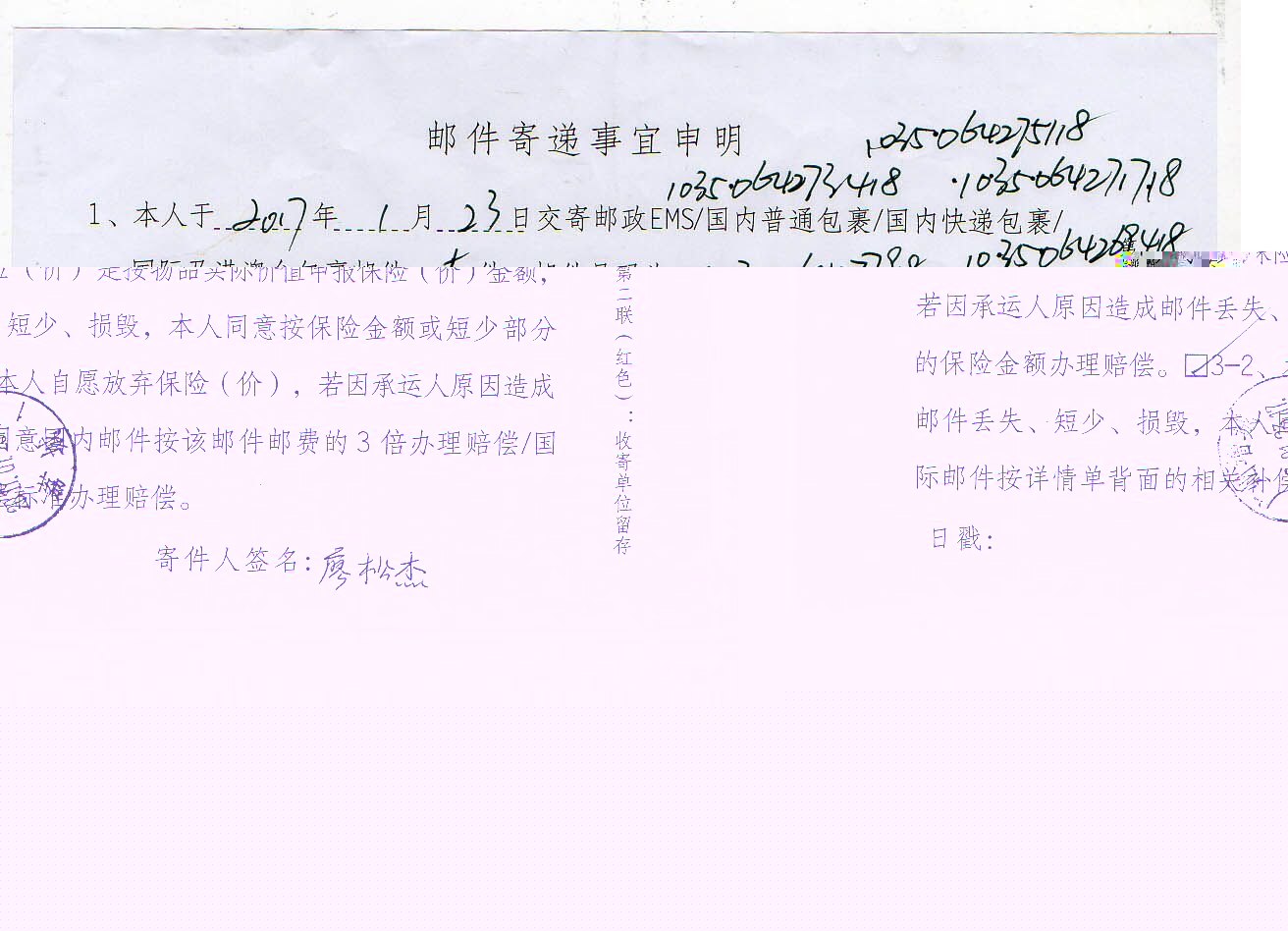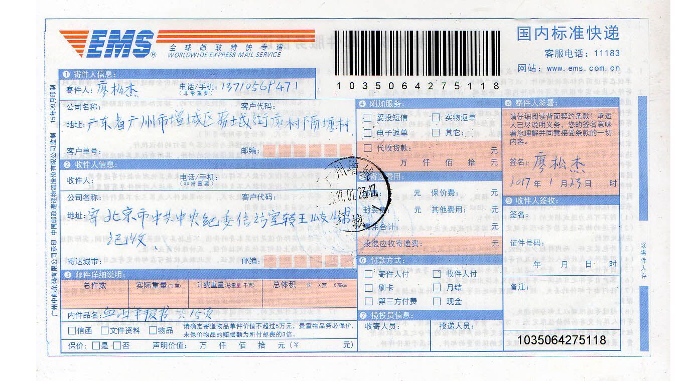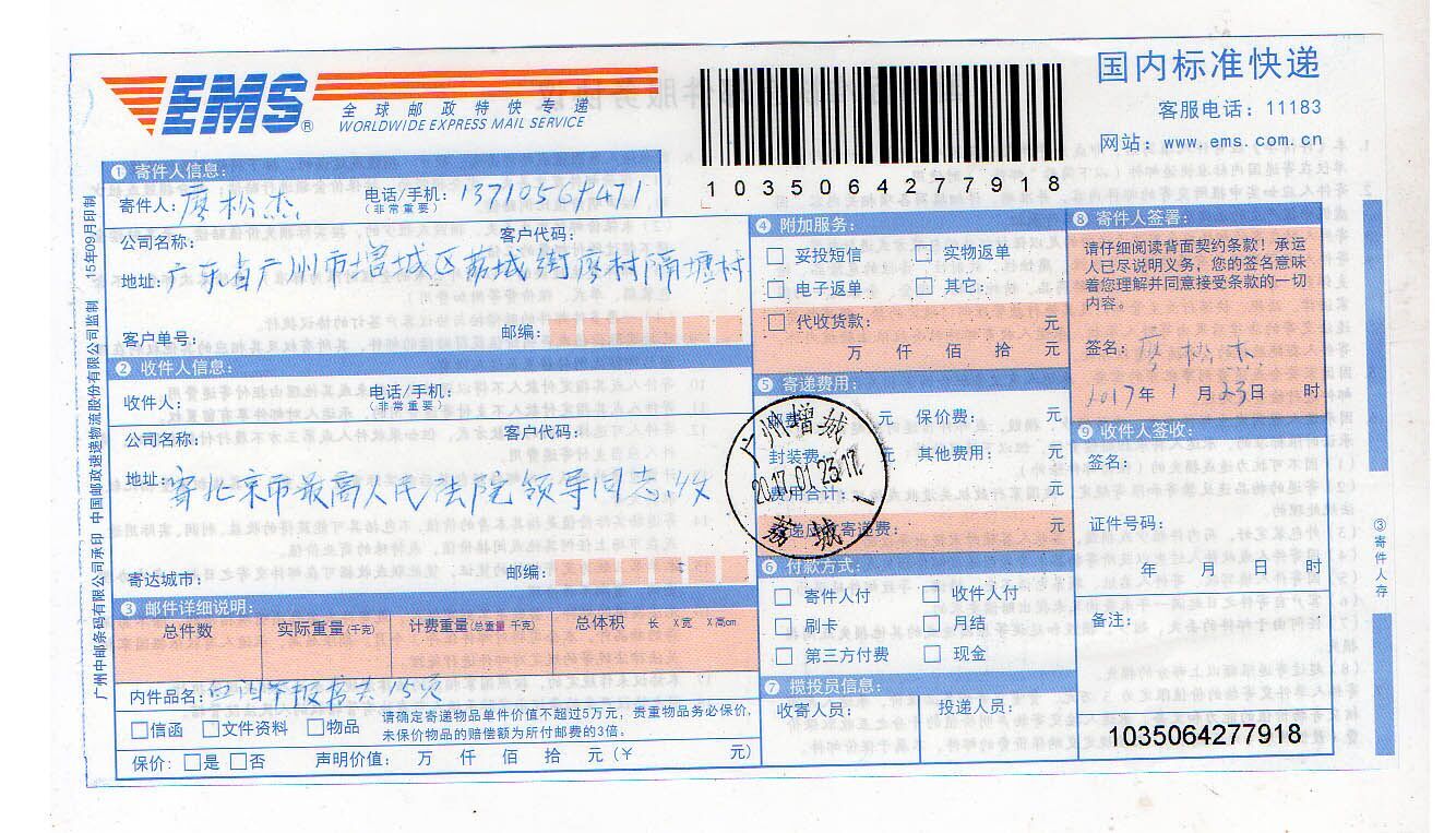 9、在我写书信寄给中央各部门时,我和我的一位证人名叫廖浩清在增城邮电局寄信时,只听领导说广东的部门可以寄,但中纪委和最高人民法院、最高人民检察院、中央人民政府以及国家信访局五个部门一律是不可以寄的,整个广州地区也是一样封住不准寄的。最后我出示了法治新闻报道网的工作证,增城邮电局的领导才先后为我寄出有10多份书信到中央各级部门,但不知他们能否收到我写的真实举报书呢?另外,为何我们广东省广州市的信不能寄上中央的各级政府部门呢?到底又有什么不可告人的秘密呢?还有更离奇的是我的案件在广东省高级人民检察院审查时,一审的广州市萝岗区人民法院,在2012年8月叫我们到去重审一次,2012年9月也叫我们到去重审一次,2012年10月16日又叫我们到去由正院长吴振主和副院长潘小登以及主审的金霞法官亲自接访了我和同案人一次,还叫我提出过诉求,并亲口表态,要依法合理解决我的案件,一共叫我签过三次笔录书,但最后广东省人民检察院把我的案件驳回和终结了。广州市萝岗区人民法院重审两次及院长接访一次,叫我签过三次笔录书的事情,连口头答复一句也没有。
