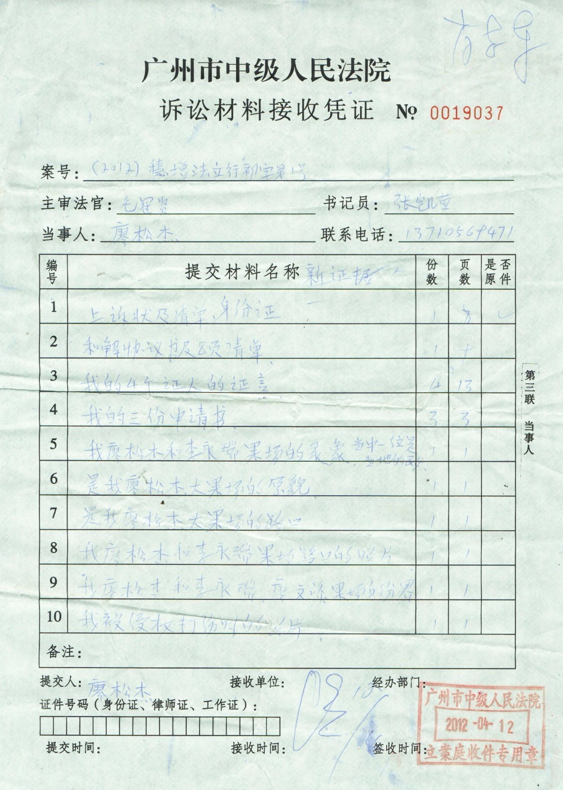 7、我只有上诉到广州市中级人民法院,我递交了10份为我作证人的证言书,以及一切的真实资料证据到法院,法官也同意我的8位证人出庭为我作过证,最后广州市中院的行政庭长张尚清和肖晓丽法官也到来调查过我的果场,了解过我果园的实情在我和我的证人及众多的村民面前也亲口表态对我说过,关于青苗只能按增城政府与我廖松杰双方达成的补偿标准执行。但历时一年又是驳回和终结了,回顾我案件上诉到广州市中级人民法院的悲惨历程,真的是没有一个人认为不悲伤的,在立案后的10个月期间,我被别人严重打伤时,我实在是无钱医病,增城政府只是每个月预支1000元给我做生活及租屋的费用,我在增城要求过数10次,要求预支点钱给我看病也无法得到,我只有泪流满面到广州市中级人民法院上访要求,在第五层楼信访室要求法官叫我们增城政府预支点钱给我看病,只听中院的领导说,叫我廖松杰不再上告了,他们才可以叫增城政府预支钱给我看病。最后也是一分钱未能得到,我只有找其他人借高利息,即借一万还二万五的钱来看病,才渡过了一次的死难。