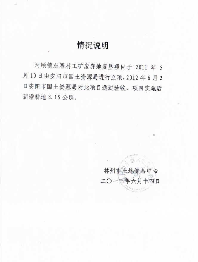 我从2004年8月1日参与郎垒尾矿坝综合治理,2006年4月6日,濮阳市林州钢铁有限责任公司石村铁矿给我签订了郎垒尾矿库综合治理补充协议书,该尾矿库是1996年经华北冶金设计研究院编制闭库方案停止使用,按照协议约定有我们在库区北部选砂,完成库区平整工作(协议附后),当时闲置多年的尾矿库已是杂草丛生,凹凸不平,其中三个大坑最深处达63米,整个尾矿库已面目全非,每到汛期成为防洪重点,2008年,我们开始平整库区,2009年,我办理了土地复耕营业执照,2010年我们向安阳市国土局申报土地复耕计划,2011年安阳市国土局给我们立项,2012年6月2日,安阳市国土局对该项目验收,新增耕地125亩,2015年安阳市国土局又进行了第二期验收,我又复耕新增土地188亩,现在,整个库区还剩的三期待复耕土地100多亩已完成80%工程量,正在准备申请验收立项。12年来,我累计投资达700多万元,先后复耕土地300多亩,林地栽种的1万多棵果树已有4000多棵现已挂果。12年来,我们全家和亲戚朋友的人力财力全部投入到了库区土地复耕中,12年来我们全家吃住在库区,离家不足1000米也几乎没回过家,