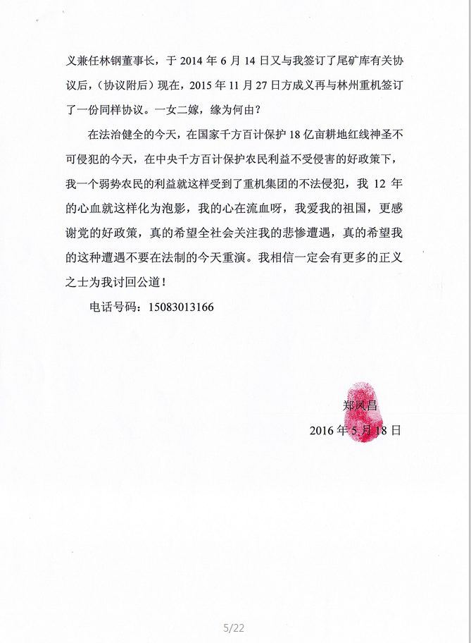 我叫郑凤昌,现年59岁,是河南省林州市河顺镇东寨村农民,向您反映解决“林州市人大财经委主任方成义兼林钢钢铁有限公司法定代表人执行董事、林州重机集团股份有限公司合谋(官商勾结)、无视党纪、国法,公然非法强占农田林地,强取豪夺他人的合法经营权严重侵害公民合法权益,造成我巨大经济损失”之事,呈请您在百忙之中阅示。