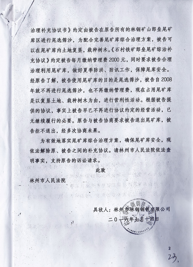 为了响应政府号召,实施林州郎垒尾矿坝综合治理方案,我从2004年8月1日参与尾矿坝综合治理,2006年4月6日濮阳市钢铁有限责任公司石村铁矿给我签订《郎垒尾矿坝库综合治理补偿协议书》(附后1),该尾矿库是1996年经华北冶金设计研究院编制闭库方案停止使用,按照协议约定我们在库区北部选砂,完成库区平整、土地复垦、栽种树木,并对此做好看管工作。