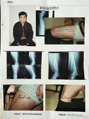 “2017年8月17日,我儿媳妇(娟娟)在医院待产,并于当晚,次孙(君君)诞生。次日早晨7:40-8:20分这段时间,我儿子(郭佳俊)数次与我们联系不上(因他不知我和他爸被非法拘禁在办事处)并 回家拿婴儿及自己的日常生活用品。当离家只有四五十米远之时,只看见一两百人围住了自己的家。他还没有反映过来是什么事,只听到违法强拆队伍中有一个人大声喊到:‘郭建德的崽回来了,搞死他!’话音未落 ,一个丧尽天良者随即用灭火器喷射我儿子双眼,数十人团团将他围住,其中五六个人将其拳打脚踢,在恣意妄为的暴力殴打之下,已是面目全非。当送到株洲市第三人民医院时,因伤势太重,医院拒绝接诊,后又 送往株洲市伤科医院治疗。经鉴定为轻伤一级。”说到此,漆美炎两眼婆娑,泪如泉涌。