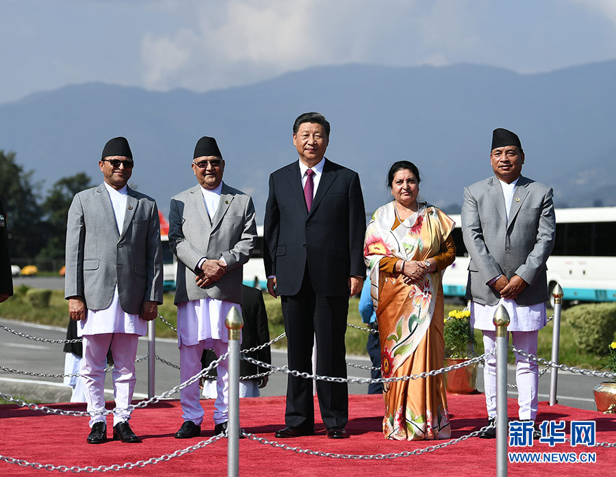 当地时间10月13日中午,国家主席习近平离开加德满都启程回国。尼泊尔总统班达里在机场为习近平举行隆重欢送仪式。尼泊尔副总统普恩、总理奥利、联邦议会联邦院主席蒂米尔西纳、所有内阁成员、军方高级将领参加。 新华社记者 高洁 摄