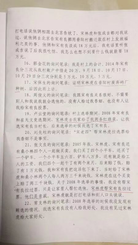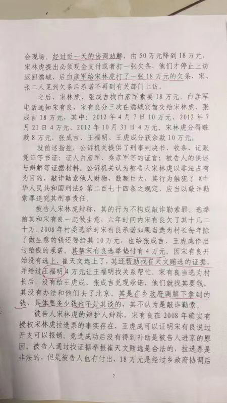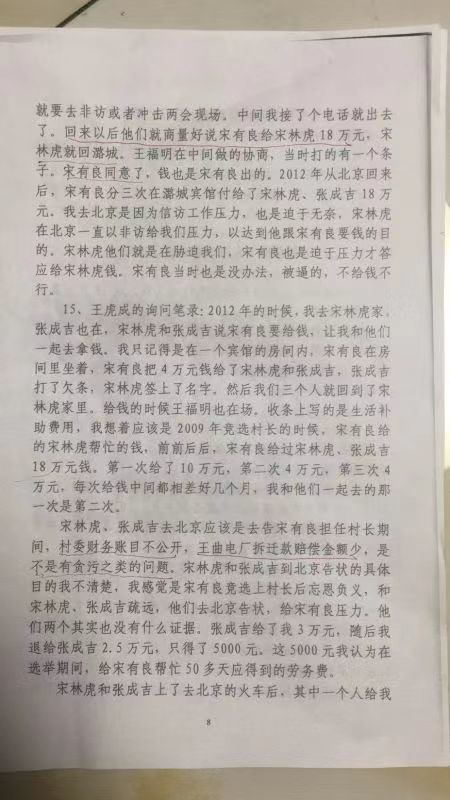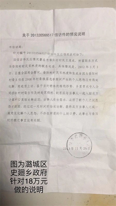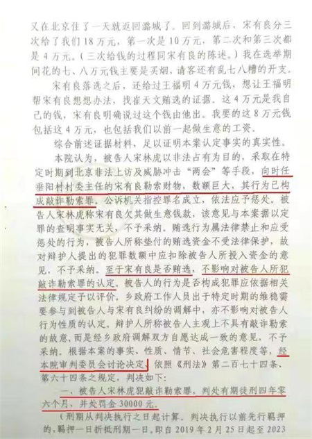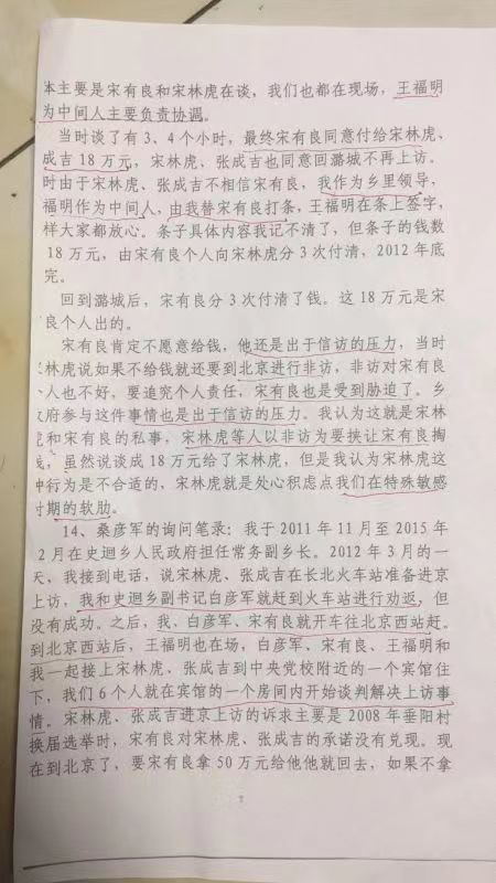 三、该判决书中第7页,史迴乡党委副书记白彦军的询问笔录:“宋有良肯定不愿意给钱,他还是出于信访的压力,当时宋林虎说如果不给钱就还要到北京进行非访,非访对宋有良个 人也不好,要追究个人责任,宋有良也是受到了胁迫了。乡政府参与这件事情也是出于信访的压力。我认为这就是宋林虎和宋有良的私事,宋林虎等人以非访为要挟让宋有良掏钱,虽然说谈成18万元给了宋林虎,但 是我认为宋林虎这种行为是不合适的,宋林虎就是处心积虑点我们在特殊敏感时期的软肋。”