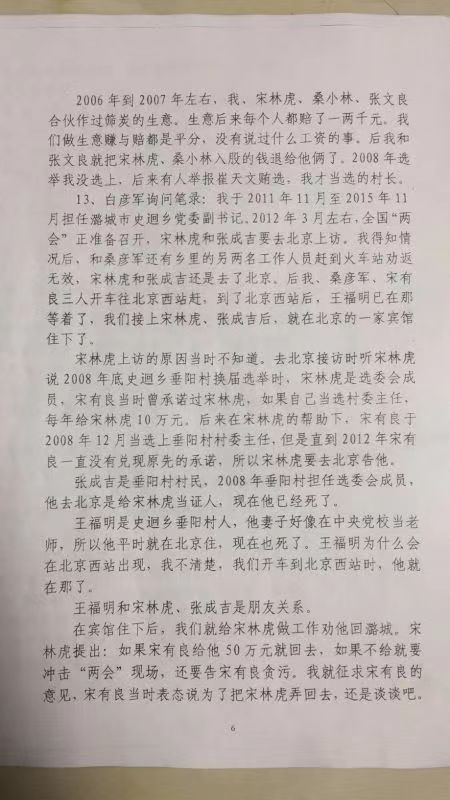 该判决书审理查明部分第4页,所谓的举报人,也是本案的“受害人”宋有良的询问笔录:“2012年3月份左右,史迴乡政府副书记白彦军和桑彦军跟我说宋林虎和张成吉已到北京上访, 让我和白彦军、桑彦军三人到北京接访”。