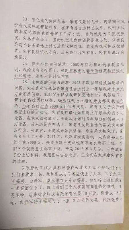 见该判决书审理查明部分第6页,白彦军的询问笔录:“宋林虎上访的原因当时不知道,去北京接访时听宋林虎说,2008年底史迴乡垂阳村换届选举时,宋林虎是选委会成员,宋有良 当时曾承诺过宋林虎,如果自己当选村委主任,每年给宋林虎10万元,后来在宋林虎的帮助下,宋有良于2008年12月当选上垂阳村村委主任,但是直到2012年宋有良一直没有兑现原先的承诺,所以宋林虎要去北京告 他。”