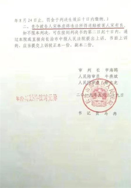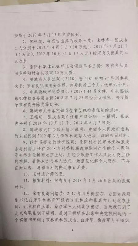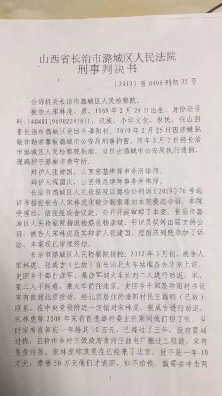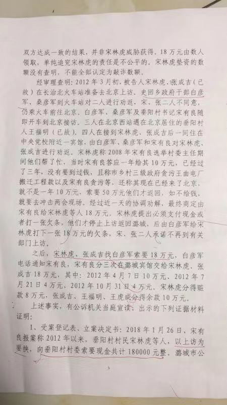 在这种情况下,我丈夫宋林虎才于2012年3月初同张成吉直接进京反映举报。当宋林虎、张成吉二人刚坐车到达北京火车西站,就被史迴乡党委副书记白彦军等乡政府领导,将我丈夫等二人诱惑拉到 中央党校附近的一个宾馆。史迴乡党委副书记白彦军等人深怕我丈夫等二人,揭露、举报史迴乡相关主要领导与我村村霸宋有良共同侵吞、瓜分我村225户的巨额拆迁款等系列犯罪行为,主动提出给18万元作为我丈 夫等几人的经济补偿,说的直白一点,也就是封口费。时隔六年多后,宋有良担心他的犯罪行为在扫黑除恶专项斗争中再遭举报,再加上两个关键当事人王福明、张成吉已故(死无对证),便采取恶人先告状的手段 ,以敲诈勒索为名,将我丈夫宋林虎告到原潞城市公安局。潞城区的一审法院在对该案的审理判决中并未对该案前因后果、是非曲直进行全面地认真详细剖析、判断,就盲目、武断地采纳从事实上根本站不住脚的证 据(不排除奉命办案),对我丈夫枉法判决。