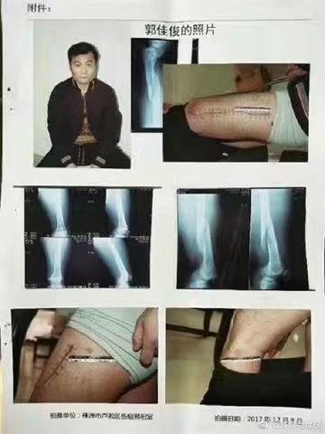郭建德在回忆事发当天依然记忆犹新,心有余悸:“2017年8月18日早上7点许,我去株洲市中南无线电厂菜市场买菜,买好菜后正准备放入自己的车内,刹那间”来了十几个不明身份的人,有的卡脖子、有的抬手脚,强行将我抬到了离我停车一百多米远的一台 微型车上,上车后,五六个人不由分说地将我死死摁住,差点导致休克。微型车直接开进了金山街道办事处,我被非法拘禁在二楼(征地拆迁指挥部),我气愤填膺地问道:‘你们凭什么非法绑架、非法拘禁我!?’ 话音未落,如同雨点般的拳打脚踢重重地落在我身上,双颊被毒打得红肿、两眼青紫难辨、手脚被反绑、嘴巴被胶带严严封实,瞬间只感觉疼痛难忍,头脑一片昏厥!在此值得一提的是,当时目睹此无人道、残忍至 极的一幕有金山街道办事处的工作人员欧阳志,该区公安分局金山派出所驻地片警李陵却熟视无睹,视而不见。”