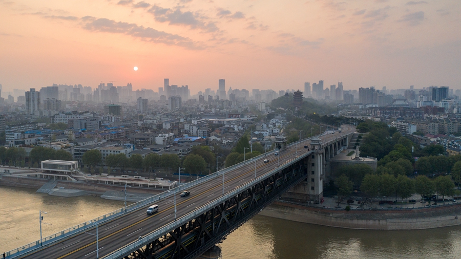 这是2020年4月8日早上的武汉长江大桥桥头。新华网 陈有军 摄