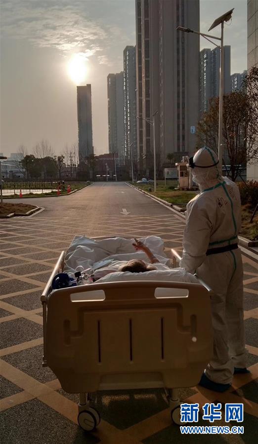 3月5日傍晚,在武汉大学人民医院东院,复旦大学附属中山医院支援湖北医疗队的刘凯在护送患者做CT的途中停下,让住院近一个月的87岁老人欣赏久违的日落。 新华社发(甘俊超 摄)