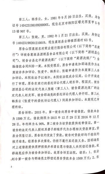 襄垣县源顺昌食品有限公司(以下简称:源顺昌)成立于2009年4月,是由本人与我母亲张爱平共同合伙出资的公司(张敏和张爱平各占公司50%股权),该公司与邵海亮无任何关系,但邵海亮,马 锋,郝瑞芹,于2015年12月份在我公司毫不知情的情况下,打着我公司的招牌,使用阴谋设计的手段窃取我公司的印章,并伪造授权委托书及相关贷款手续,与襄垣农商行相关负责人狼狈为奸,内外勾结,合伙诈骗 巨额贷款达1500万元。该贷款到期后,邵海亮拒不归还,襄垣农商行以此贷款诉讼到襄垣人民法院,襄垣人民法院判令该笔贷款及利息由我公司负责偿还。并将作为法定代表人的反映举报人张敏采取了“限高令”措施 。此后,我公司多次找邵海亮,要求他偿还该笔贷款,其初始还表示愿意归还该笔贷款,但几年来,其始终没有归还该笔贷款分文。2020年7月23日两位反映举报人找到赵炎军,桑彩云夫妇索要其侵占源顺 昌的200余万元资金,被其家人及亲属暴力殴打,两位举报人已于当日报案至襄垣县富阳派出所。最近,各级政府的相关部门加大力度,组织清收处置农商银行风险资产的专项行动,两位反映举报人在此情 况下,只好将邵海亮等人采取欺诈手段诈骗襄垣农商行1500万巨额资金的犯罪行为,于2020年8月24日主动到襄垣县公安局进行报案。