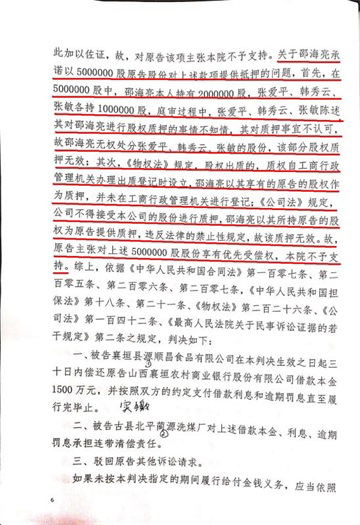 该判决书又体现到,在该案的审理中,审判人员发现邵海亮与农商行某些负责人内外勾结,在张爱平、张敏、韩秀云三人毫不知情的情况下,利用其三人各自在襄垣农商银行的股权作为该笔贷款的 抵押,因张爱平、韩秀云、张敏对邵海亮进行股权质押的事情不知情,对质押事宜不认可,故邵海亮无权处分张爱平、韩秀云、张敏的股份,该部分股权质押无效;其次,《物权法》规定,股权出质的,质权自工商 行政管理机关办理出质登记时设立,邵海亮以其享有的原告的股权作为质押,并未在工商行政管理机关进行登记;《公司法》规定,公司不得接受本公司的股份进行质押,邵海亮以其所持原告的股权为原告提供质押 ,违反法律的禁止性规定,故该质押无效。那么襄垣农商行为何接受邵海亮的股权质押?是襄垣农商行不懂法,还是他们知法犯法?