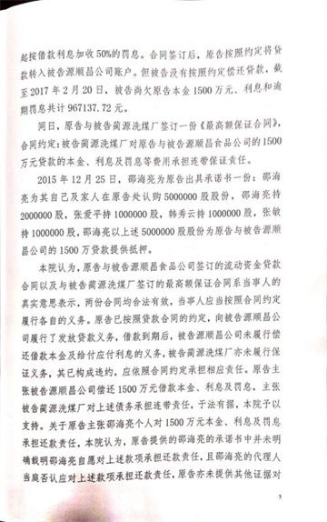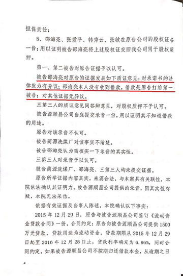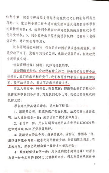 襄垣县人民法院对该笔贷款的2017晋0423民初229号民事判决书中提现到,邵海亮对该笔贷款的最终答辩意见是:“我们和原告的承诺不符合法律规定,没有法律效力,我方不应承担还款义务 ”。同时在质证时,邵海亮的质证意见又是:“本人没有收到借款,借款是原告打给第一被告的。”妄想以此来佐证他在答辩时的“我方不应承担还款义务”的主张。
