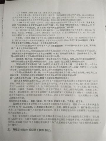 “2008年9月3日原‘关小平,书记主持召开县委四套班子第10次会议纪要:实事求是认定“水利局南水北调管理站职工连续工作满14年,形成了事实劳动关系。(实际应从74年——08 年为34年劳动关系,08 年后60周岁间未签合同双倍工资年限)