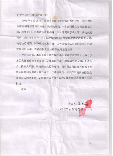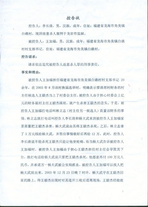 我的胞弟李长清系2003年白蕉村枪杀案的同案犯之一,现在龙岩监狱服刑,其于2009年4月18日实名举报本案的幕后组织者、指使者王加福书记,指控他参与了策划和唆使林立志、杨大武等人枪杀王 毅杰的犯罪事实,希望有关部门查清事实真相,使王加福得到应有的法律惩处。但从2009年至今,这件事情却仍然没有引起有关部门的重视,我也长期多次信访反映,要求追究幕后凶手的法律责任,也是迟迟没有回 复和调查处理。