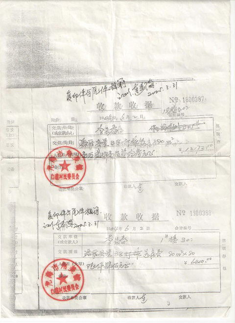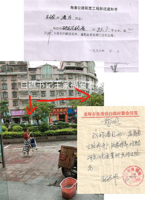 安置地的收款收据照片,向潘目购买了拆迁证,白礁村部证明,(白礁书记王加福房子、5号楼十多间店面照片)。